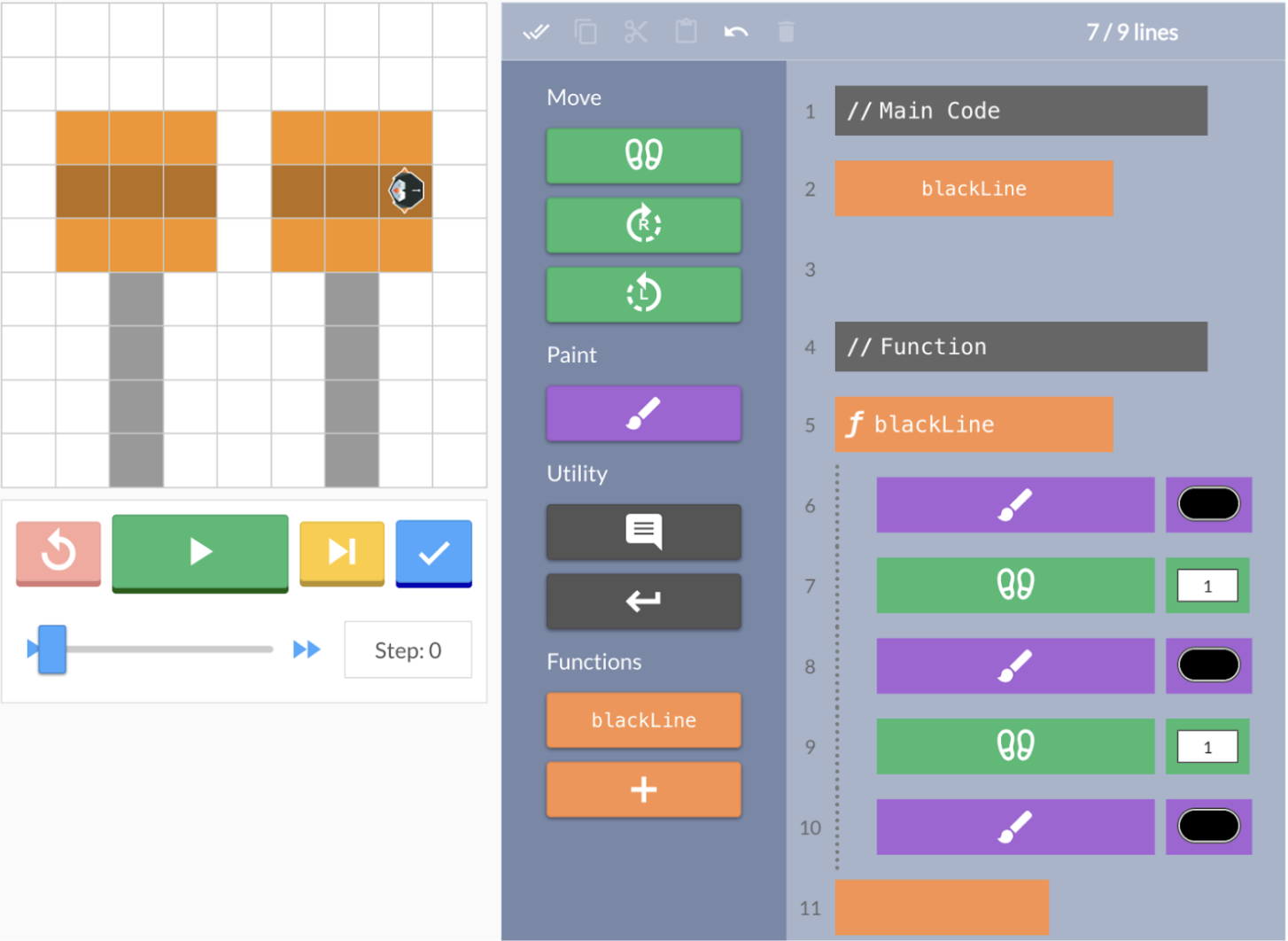 In this module, students are introduced to functions and learn how to define and call functions to solve challenges in PixelBots. Throughout the module, students will practice decomposing shapes using the Break It Down strategy to code candy-themed challenges with functions. Students will also learn how to organize their code with their main code at the top and all function definitions at the bottom separated with line breaks. By the end of this module, students will have a strong foundational knowledge of how functions work and why they are useful.