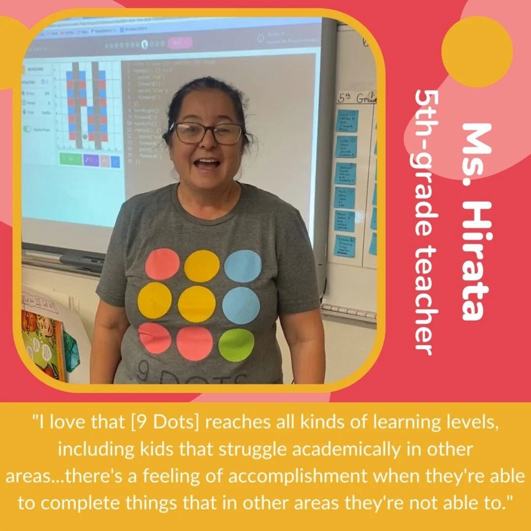 9 Dots was founded as a small after-school program at a Hollywood elementary school with the goal of teaching STEM skills in an engaging way. Now, the 9 Dots Get Coding program serves over 8,000 K-6 students and 310 teachers at Title I elementary schools throughout the greater Los Angeles area, teaching kids the CS skills they need to thrive in our technological world. As a community of educators, researchers, and engineers, 9 Dots is committed to bringing transformative CS education to all students – particularly those from historically underserved and under-resourced communities. By creating engaging learning environments that foster joy, promote fearlessness in problem solving, and support students in building their identity as a coder, we aim to empower students to rethink the way they voice their ideas, understand their world, and imagine their future.