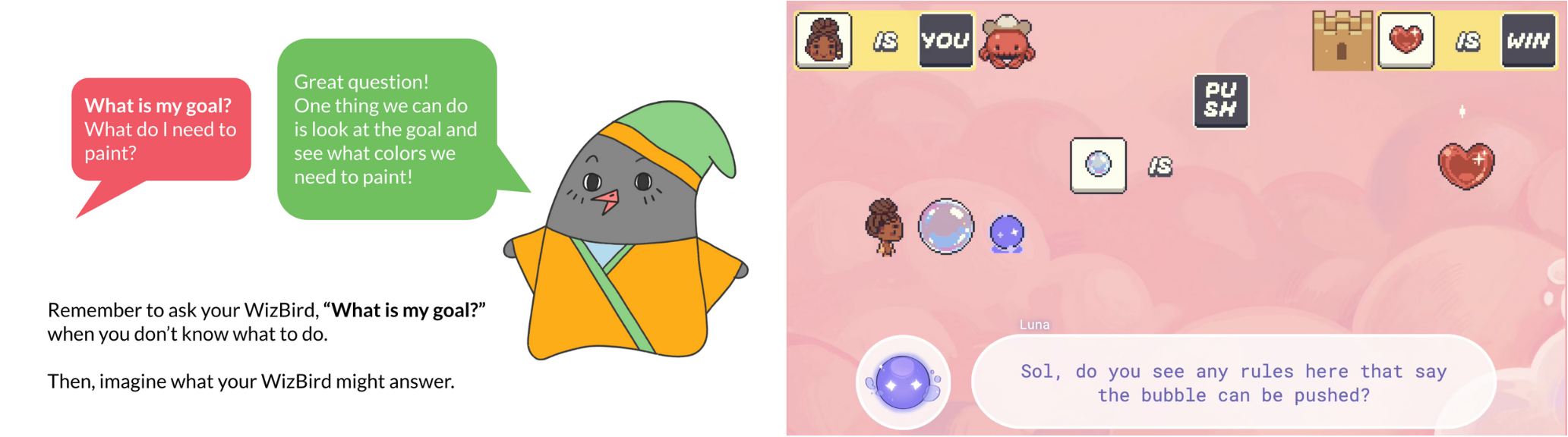 The Rewriters builds on the mechanics of indie puzzle game Baba Is You, but with original art, narrative, and scaffolded problem sets designed for 3rd graders. Lessons focus on teaching a four-step problem-solving framework that can also be applied across disciplines: