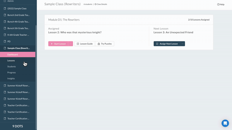 Click on “Start Lesson” to open the main slides (note: slides are opened and presented on the 9 Dots platform itself, unlike with PixelBots slides that open in a new tab).